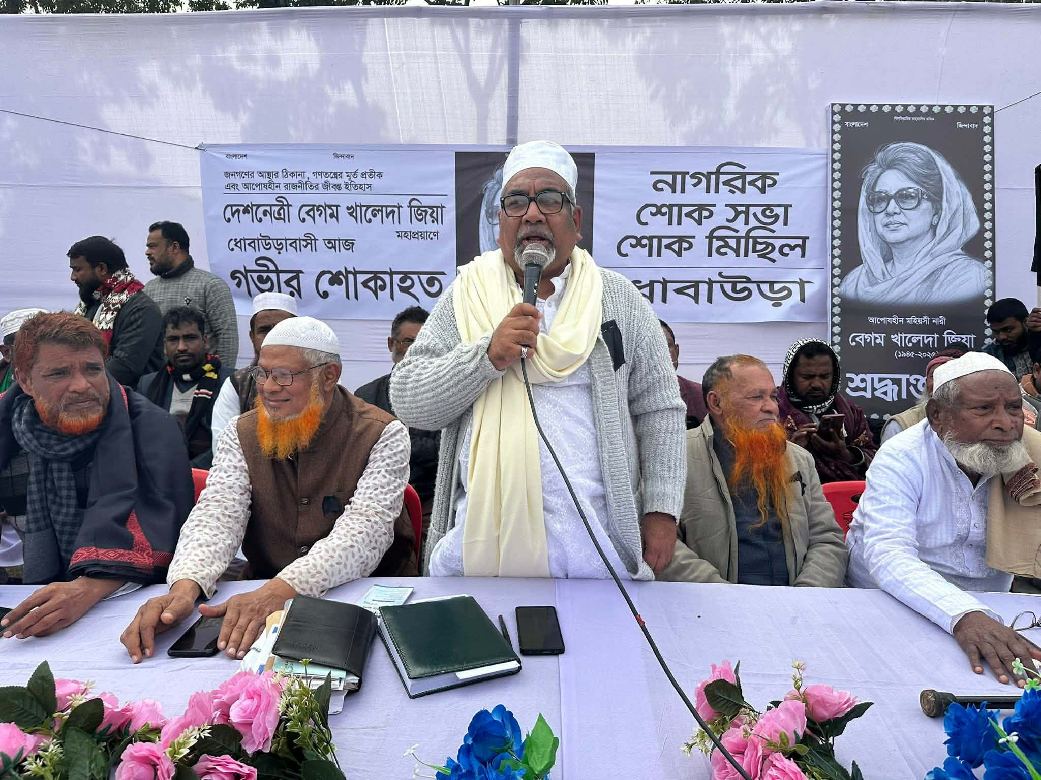 বিএনপির চেয়ারপারসন, সাবেক প্রধানমন্ত্রী ও আপসহীন গণতন্ত্রের প্রতীক দেশনেত্রী বেগম খালেদা জিয়ার মৃত্যুতে ধোবাউড়ায় নাগরিক শোক সভা ও শোক মিছিল অনুষ্ঠিত হয়েছে। ধোবাউড়ার ইতিহাসে সর্ববৃহৎ এই নাগরিক শোক সভা ও মিছিলে বিএনপি, জামায়াতে ইসলামী , জমিয়তে উলামায়ে ইসলাম , গণ অধিকার পরিষদসহ বিভিন্ন রাজনৈতিক , পেশাজবী ও সামাজিক সংগঠনের নেতৃবৃন্দ ছাড়াও শিক্ষক , মুক্তিযোদ্ধা,আলেম, ওলামা , সাংবাদিক , ব্যবসায়ী, কর্মজীবী ,সাংস্কৃতিক কর্মী, গারো, হাজং , হিন্দু, শ্রমিক , কৃষক , শিক্ষার্থীসহ সাধারণ মানুষ ও নেতাকর্মী কালো পতাকা নিয়ে যোগ দেন । শোক মিছিলের অগ্রভাগে বেগম খালেদা জিয়ার বিশাল প্রতিকৃতি বহন করা হয়।