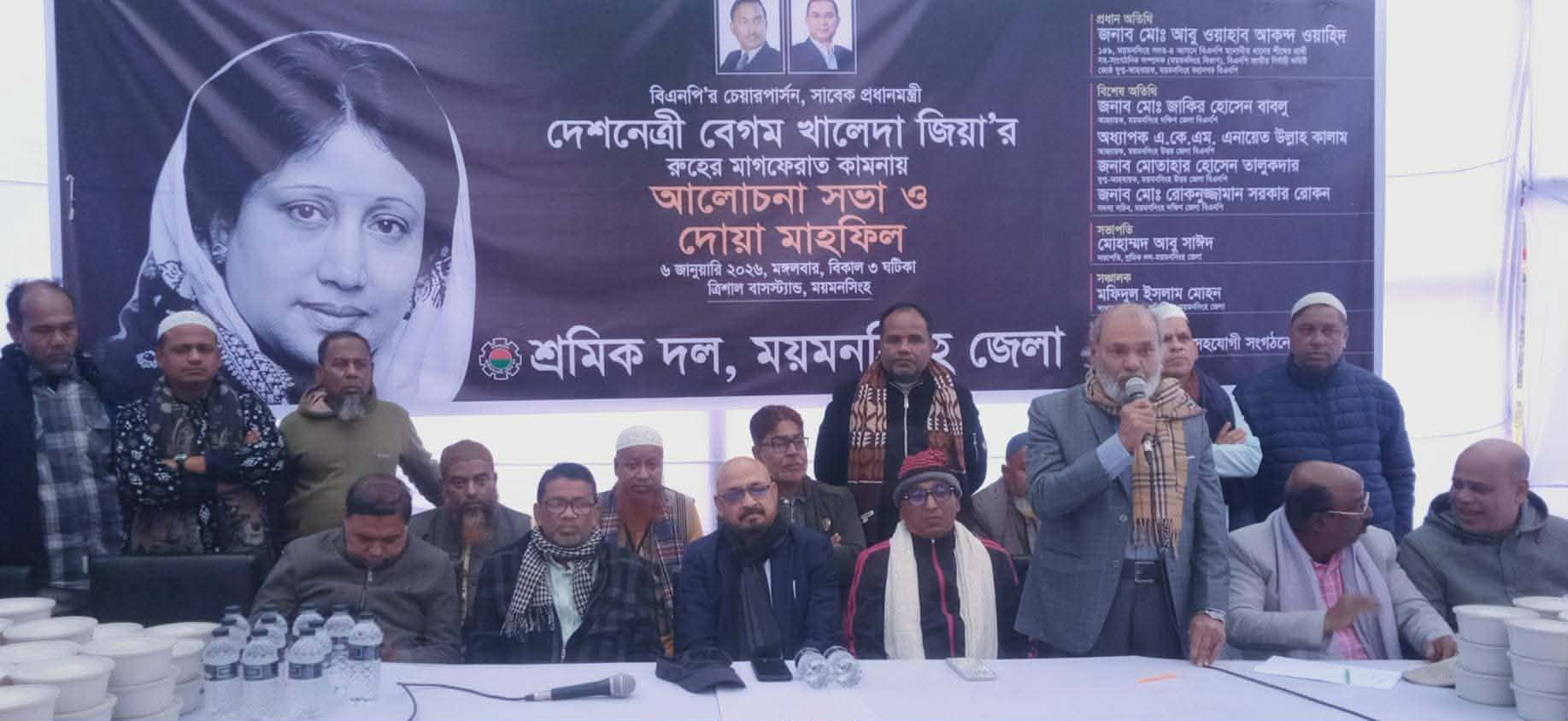 ময়মনসিংহ জেলা শ্রমিক দলের উদ্যোগে বিএনপির চেয়ারপার্সন ও সাবেক প্রধানমন্ত্রী দেশনেত্রী বেগম খালেদা জিয়ার রুহের মাগফেরাত কামনায় আলোচনা সভা ও দোয়া মাহফিল অনুষ্ঠিত হয়েছে।