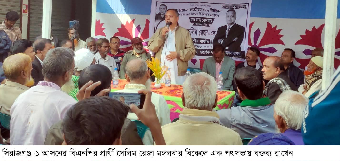 সিরাজগঞ্জ-১ কাজিপুর ও সদরের আংশিক)আসনের বিএনপির প্রার্থী সেলিম রেজা ভোটারদের দ্বারে দ্বারে যাচ্ছেন।নানা প্রতিশ্রুতি দিয়ে ভোটারদের মন জয় করার চেষ্টা করে ধানের শীষে ভোট প্রার্থনা করছেন।মঙ্গলবার( ৩ ফেব্রুয়ারি)সকাল থেকে বিকেল পর্যন্ত নির্বাচনী এলাকার রতনকান্দি, মহিষামুড়া চৌরাস্তা, একডালা, বয়রা ও ভেন্নাবাড়ি এলাকায় গণসংযোগ করেন।এসময় দুইস্থানে পথসভায় তিনি বক্তব্য রাখেন। বক্তব্যে মাদক, সন্ত্রাস, বালুখেকো ও দখলবাজির বিরুদ্ধে জিরো টলারেন্স নীতির উল্লেখ করে সেলিম রেজা বলেন, ‘অপরাধী যে দলেরই হোক না কেনো, তাদের বিরুদ্ধে আমার স্পষ্ট ঘোষণা, নির্বাচিত হলে তাদের কোন অস্তিত্ব কাজিপুরে রাখবো না।’ একইসাথে তিনি জনগণের মতামতের ভিত্তিতে সকল উন্নয়ন কর্মকান্ড পরিচালনার অঙ্গীকার করে তাকে আগামী ১২ তারিখে ধানের শীষে ভোট দেবার আহবান জানান।