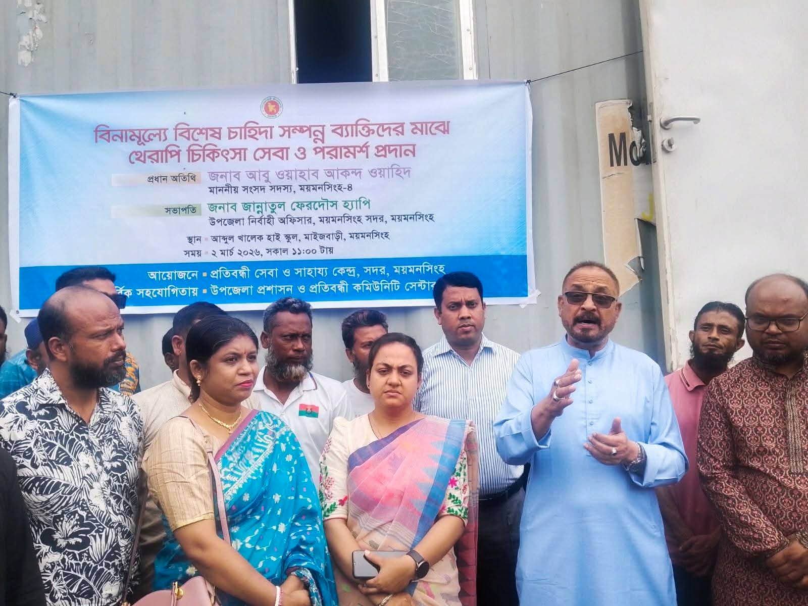 "প্রত্যেকটি জীবন মূল্যবান, সবার জন্য সমান সুযোগ নিশ্চিত করতে হবে” এই অঙ্গীকারকে সামনে রেখে (২ মার্চ ২০২৬) তারিখে ময়মনসিংহ সদরে বিশেষ চাহিদা সম্পন্ন ব্যক্তিদের জন্য দিনব্যাপী বিনামূল্যে থেরাপি চিকিৎসা ও পরামর্শ সেবা কর্মসূচি অনুষ্ঠিত হয়েছে।