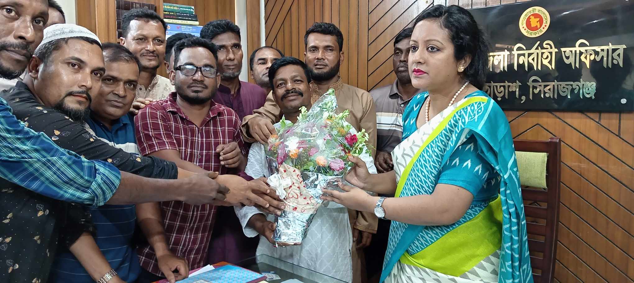 সিরাজগঞ্জের তাড়াশ উপজেলা নির্বাহী অফিসারকে ফুলেল শুভেচ্ছা জানালেন তাড়াশ উপজেলা মৎস্যজীবী দল। সোমবার সকালে উপজেলা নির্বাহী কর্মকর্তার কার্যালয়ে গিয়ে ওই ফুলেল শুভেতাড়াশচ্ছা জানানো হয়। এ সময় উপস্থিত ছিলেন উপজেলা মৎস্যজীবী দলের সভাপতি মো. নায়েব আলী ও সাধারণ সম্পাদক স ম আব্দুর রহমান সহ অর্ধশতাধিক নেতা কর্মী। উল্লেখ্য :উপজেলা নির্বাহী কর্মকর্তা নুসরাত জাহান গত (৩ জুন) তাড়াশ উপজেলায় যোগদান করেন। তিনি তাড়াশ উপজেলার উন্নয়নে সকলের সার্বিক সহযোগিতা কামনা করেন।
