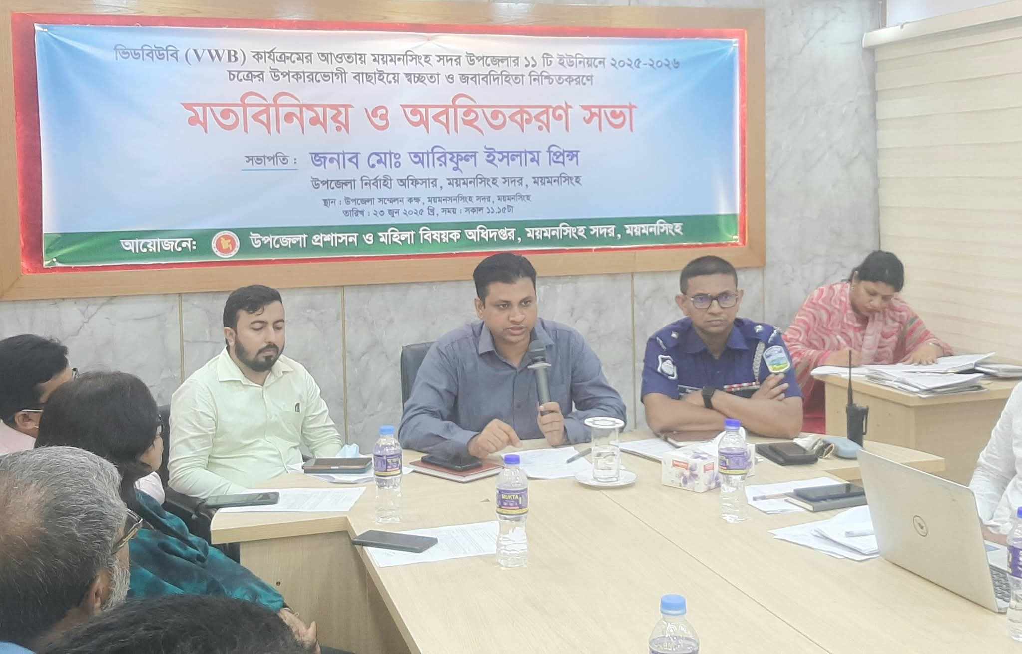 ময়মনসিংহ সদর উপজেলায় ভালনারেবল উইমেন বেনেফিট (ভিডব্লিউবি) কার্যক্রমের আওতায় ১ জানুয়ারী ২০২৫ হতে ৩১ ডিসেম্বর ২০২৬ চক্রের (ভিডব্লিউবি) উপকারভোগী নির্বাচন, খাদ্য ও কার্ড বিতরণে বাছাই ও নিশ্চিত করণে মতবিনিময় ও অবহিতকরণ সভা অনুষ্ঠিত হয়েছে। সোমবার (২৩ জুন) বেলা ১১ টার দিকে উপজেলা পরিষদ সভাকক্ষে উক্ত অনুষ্ঠানের আয়োজন করে উপজেলা মহিলা বিষয়ক কর্মকর্তার কার্যালয়।
