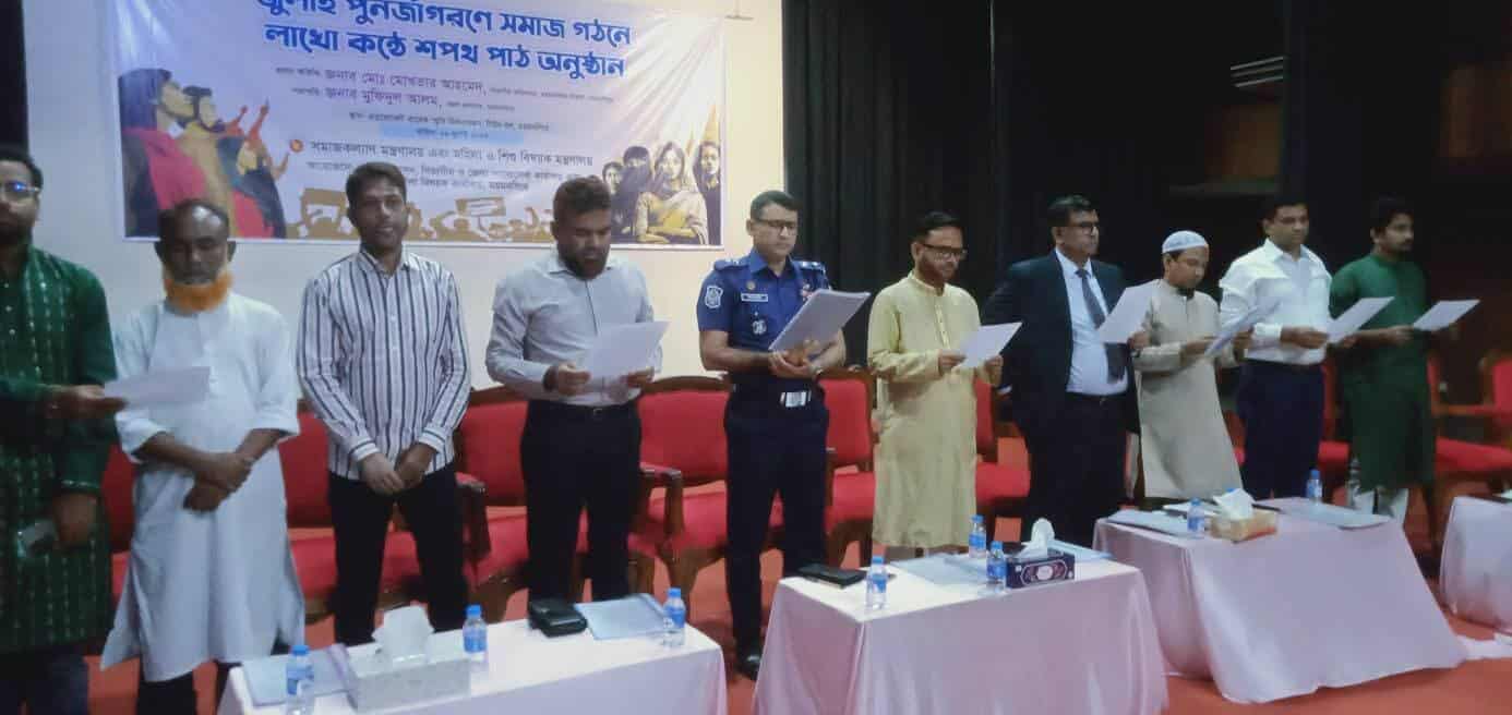 ময়মনসিংহ জেলা প্রশাসন, বিভাগীয় ও জেলা সমাজসেবা কার্যালয় এবং মহিলা বিষয়ক অধিদপ্তরের জেলা কার্যালয়ের যৌথ আয়োজনে 'জুলাই পুনর্জাগরণে সমাজ গঠনে লাখো কন্ঠে শপথ পাঠ অনুষ্ঠান' আজ সকাল ১০টায় নগরীর অ্যাডভোকেট তারেক স্মৃতি অডিটোরিয়ামে অনুষ্ঠিত হয়েছে।