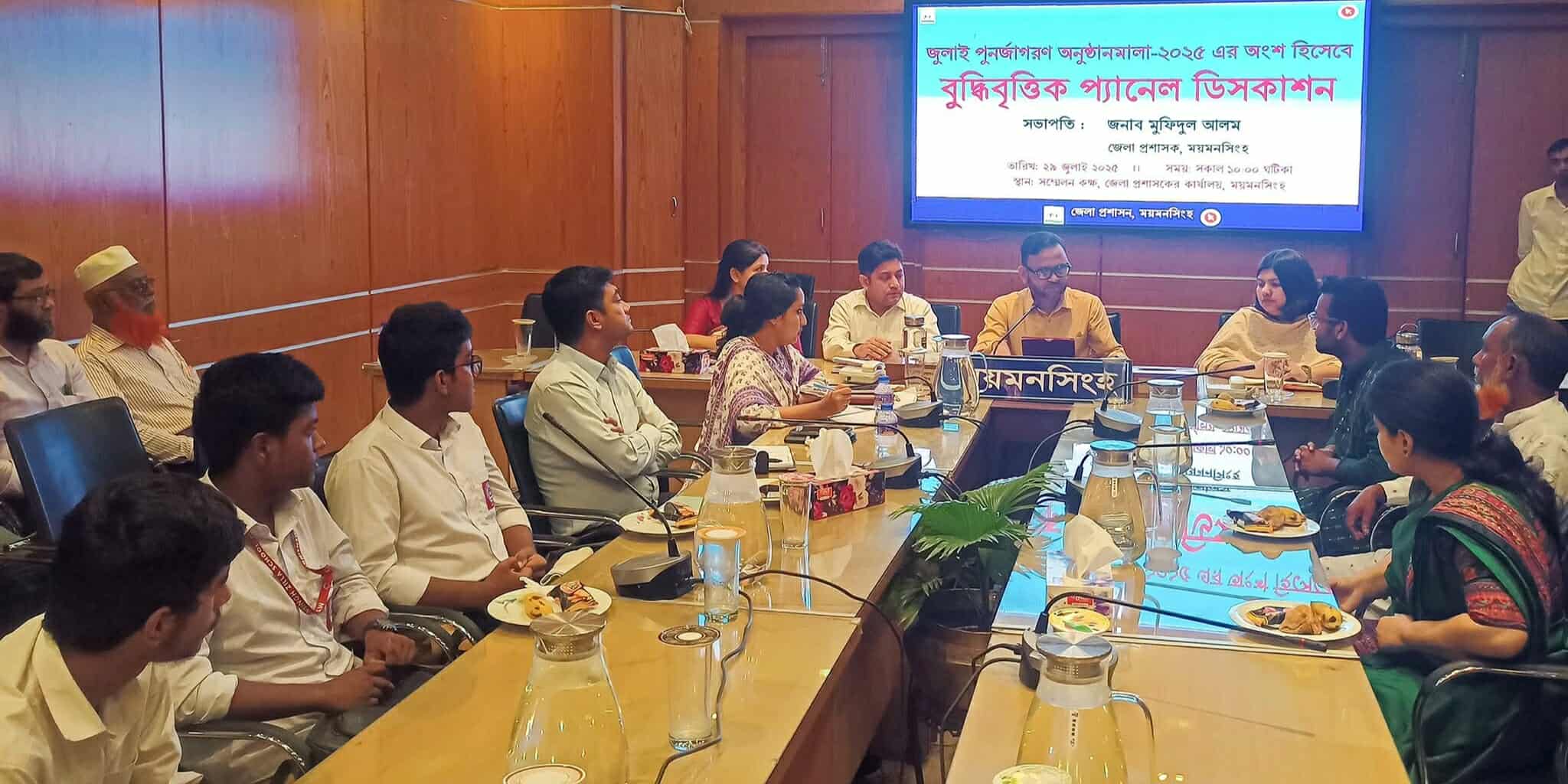 ময়মনসিংহ জেলা প্রশাসনের আয়োজনে মঙ্গলবার (২৯ জুলাই) জুলাই আন্দোলনকেন্দ্রিক 'বুদ্ধিবৃত্তিক প্যানেল ডিসকাশন' অনুষ্ঠিত হয়েছে। ময়মনসিংহ জেলা প্রশাসকের কার্যালয়ের সম্মেলনকক্ষে এদিন সকালে ময়মনসিংহ জেলা প্রশাসক মুফিদুল আলমের সভাপতিত্বে এ সভা অনুষ্ঠিত হয়।