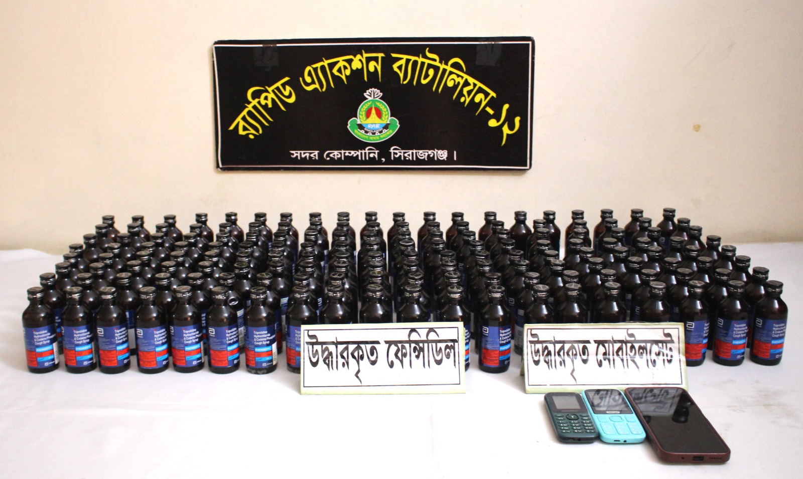 সিরাজগঞ্জে ১৫৮ বোতল ফেনসিডিলসহ তিন মাদক কারবারিকে আটক করেছে র্যাপিড এ্যাকশন ব্যাটালিয়ন র্যাব ১২ ।