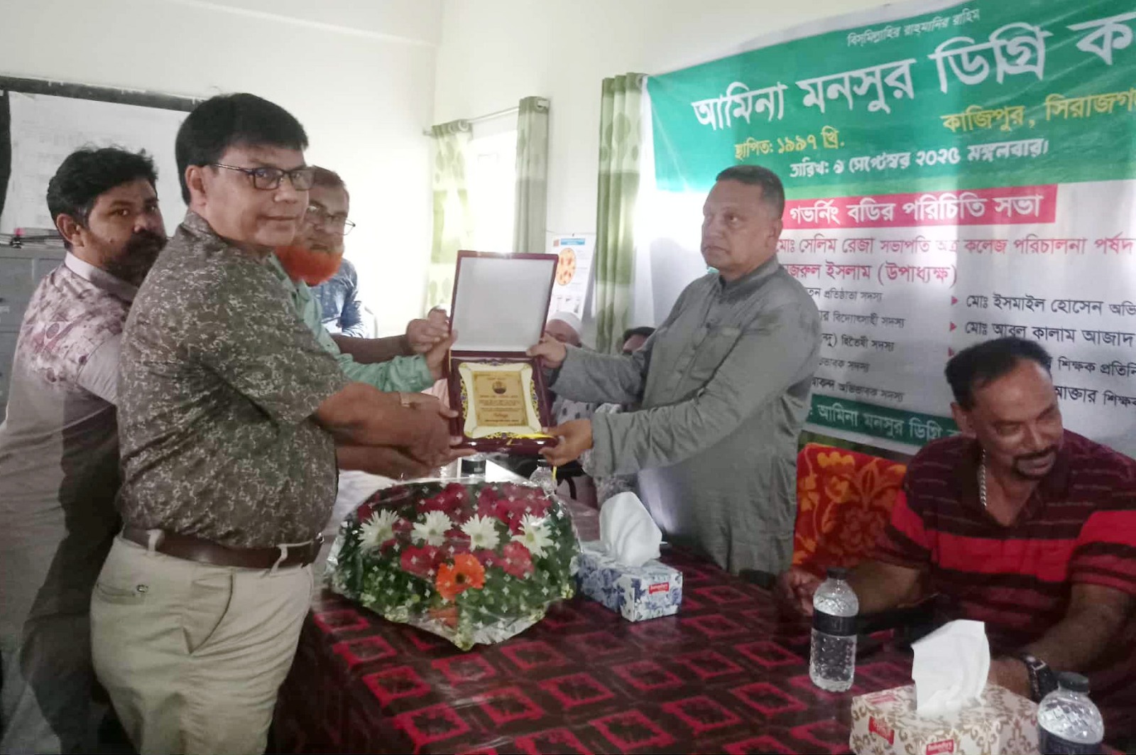 সিরাজগঞ্জের কাজিপুর উপজেলার আমিনা মনসুর ডিগ্রি কলেজ পরিচালনা কমিটির পরিচিতি সভা অনুষ্ঠিত হয়েছে। মঙ্গলবার (৯ সেপ্টেম্বর) দুপুরে কলেজের শিক্ষক মিলনায়তনে অনুষ্ঠিত সভায় সভাপতিত্ব করেন উপাধ্যক্ষ কেএম নজরুল ইসলাম। অনুষ্ঠানে প্রধান অতিথি ছিলেন কাজিপুর উপজেলা বিএনপির সাবেক সভাপতি ও ওই কলেজ পরিচালনা কমিটির সভাপতি সেলিম রেজা। অনুষ্ঠানের শুরুতে সভাপতির স্বাগত বক্তব্যের পরে নতুন পরিচালনা কমিটির সদস্যদের পরিচয় পর্ব অনুষ্ঠিত হয়। বাংলা বিভাগের সহকারী অধ্যাপক আবদুল জলিলের সঞ্চালনায় অনুষ্ঠানে বক্তব্য রাখেন পরিচালনা কমিটির সভাপতি সেলিম রেজা, হিতৈষী সদস্য সাবেক ইউপি চেয়ারম্যান রাশেদ কবির চান্দু, কলেজ হিতৈষী ডাক্তার আব্দুল জব্বার, সহকারী অধ্যাপক রেজাউল করিম। পরে কলেজ পরিচালনার জন্যে পাঁচ সদস্য বিশিষ্ট একটি পরিচালনা কমিটি গঠন করা হয়। # (ছবি আছে)