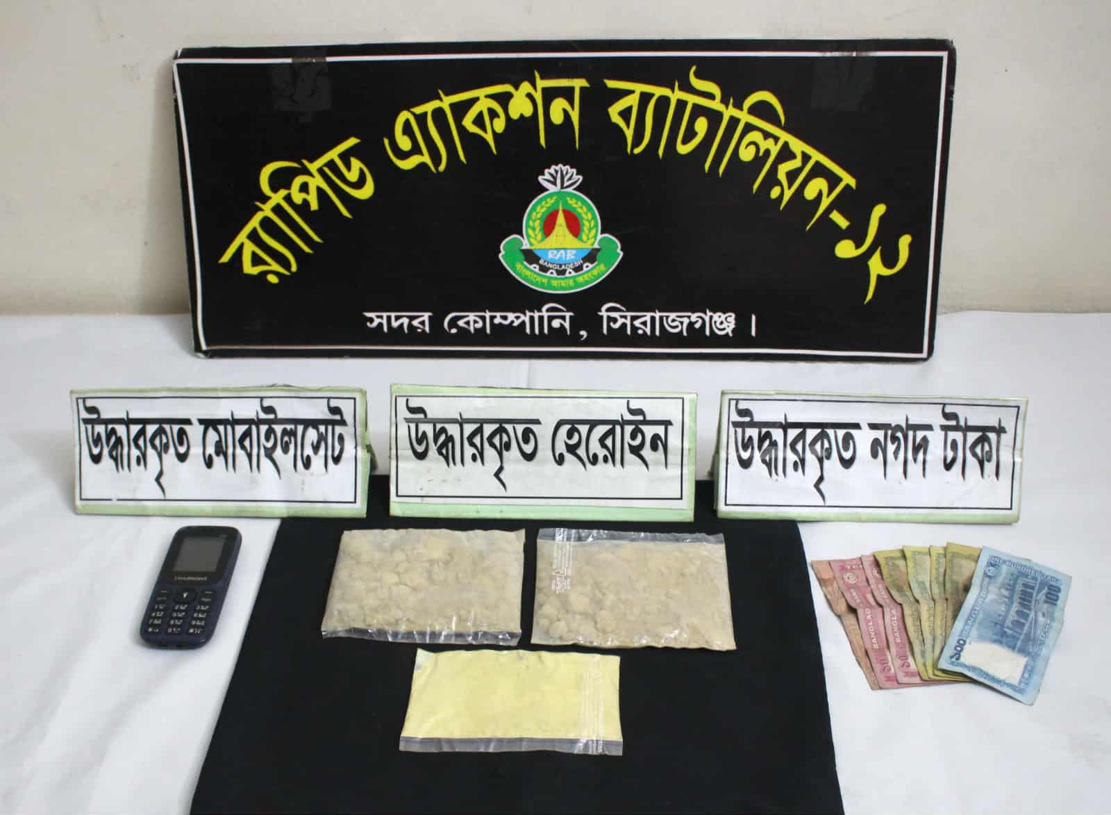 সিরাজগঞ্জের সলঙ্গায় ৭৫ গ্রাম হেরোইনসহ এক নারী মাদক কারবারিকে আটক করেছে র্যাব। সোমবার (২২ সেপ্টেম্বর) সকালে সিরাজগঞ্জ-১২ সদর কম্পানি কমান্ডার ও অতিরিক্ত পুলিশ সুপার দীপংকর ঘোষ সই করা বিজ্ঞপ্তিতে এ তথ্য জানানো হয়।আটকৃত মাদক কারবারি, মোছাঃ লুনা বেগম(৩৫) রাজশাহী জেলার দামকুড়া থানার মুড়ালীপুর গ্রামের মো. পিয়ারুল ইসলামের মেয়ে।বিজ্ঞপ্তিতে বলা হয়, সোমবার রাতে র্যাব ১২,র একটি চৌকস আভিযানিক দল জেলার সলঙ্গা থানাধীন রামারচর রয়্যাল রূপালী হাইওয়ে রেস্টুরেন্ট এর সামনে রাজশাহী হতে ঢাকাগামী মহাসড়কের উপর” একটি মাদক বিরোধী অভিযান পরিচালনা করে ৭৫ গ্রাম হেরোইনসহ লুনা বেগম নামে এক জন নারী মাদক ব্যবসায়ীকে আটক করে। এছাড়াও তার সাথে থাকা হেরোইন ক্রয়-বিক্রয় কাজে ব্যবহৃত ০১টি মোবাইল ফোন এবং নগদ ২১০/- টাকা জব্দ করা হয়।আটককৃত মাদক কারবারি বিরুদ্ধে সিরাজগঞ্জ জেলার সলঙ্গা থানায় মাদকদ্রব্য নিয়ন্ত্রণ আইনে একটি মামলা দায়ের করা হয়েছে।