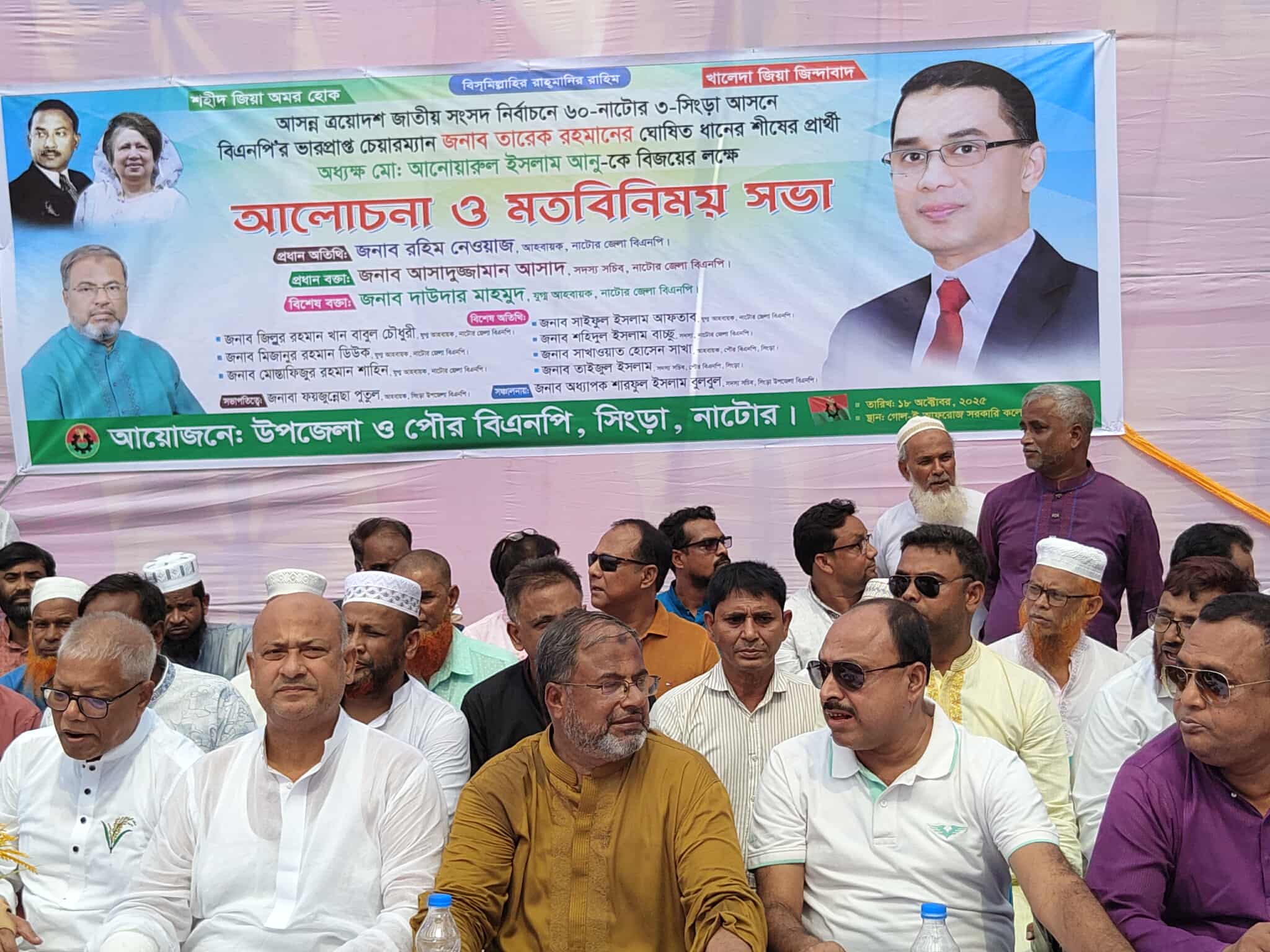 সিংড়া পৌর বিএনপি'র আহবায়ক সাখাওয়াত হোসেন সাখা-এর সভাপতিত্বে অনুষ্ঠিত এই সভা সঞ্চালনা করেন সিংড়া উপজেলা বিএনপির সদস্য সচিব অধ্যাপক শারফুল ইসলাম বুলবুল। মতবিনিময় সভায় বিশেষ অতিথি হিসেবে উপস্থিত ছিলেন নাটোর জেলা বিএনপি'র যুগ্ম আহবায়ক জিল্লুর রহমান খান বাবুল চৌধুরী, সাইফুল ইসলাম আফতাব, মিজানুর রহমান ডিউক এবং সদস্য শহিদুল ইসলাম বাচ্চু ও যুগ্ম আহবায়ক মোস্তাফিজুর রহমান শাহিন।