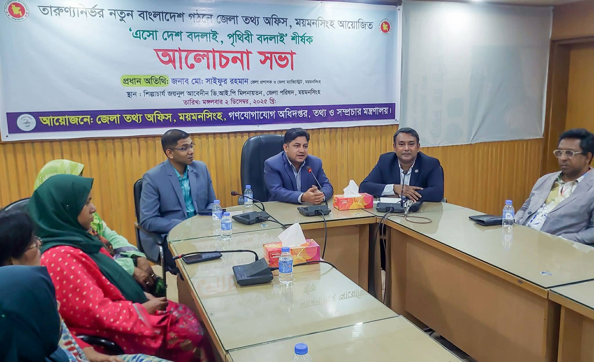 তারুণ্যনির্ভর নতুন বাংলাদেশ গঠনে জেলা তথ্য অফিস, ময়মনসিংহের আয়োজনে 'এসো দেশ বদলাই, পৃথিবী বদলাই' শীর্ষক আলোচনা সভা অনুষ্ঠিত হয়েছে। ময়মনসিংহ জেলা পরিষদের শিল্পাচার্য জয়নুল আবেদীন মিলনায়তনে মঙ্গলবার (০২ ডিসেম্বর) বিকেলে এ সভা অনুষ্ঠিত হয়।