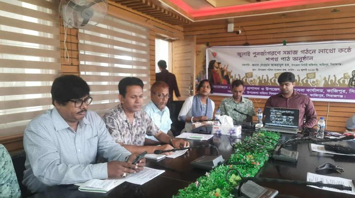 মজিবর রহমান জুলাই পুনর্জারণে সমাজ গঠনে লাখো কন্ঠে শপথ পাঠ শেষে সিরাজগঞ্জের তাড়াশে আলোচনা সভা অনুষ্ঠিত হয়েছে। শনিবার (২৬ জুলাই) সকালে উপজেলা পরিষদ মিলনায়তনে উপজেলা সমাজ সেবা কার্যালয়ের উদ্যোগে জুলাই