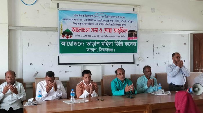 মজিবর রহমান সিরাজগঞ্জের তাড়াশ মহিলা ডিগ্রি কলেজে ধর্মীয় ভাবগাম্ভীর্যের মধ্যে দিয়ে ঈদে মিলাদুন্নবী পালিত হয়েছে। শনিবার সকালে কলেজের হলরুমে এ উপলক্ষে আলোচনা সভা, হামদ-নাত, গজল পরিবেশনা এবং দোয়া মাহফিল অনুষ্ঠিত আরও পড়ুন...